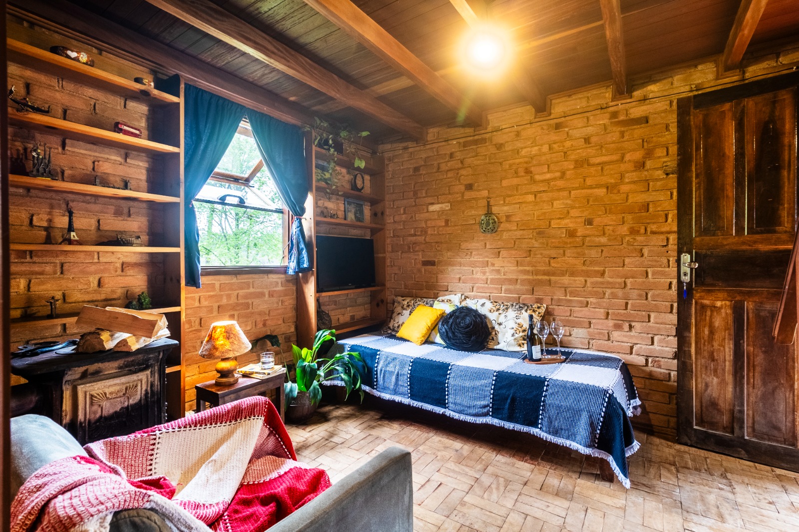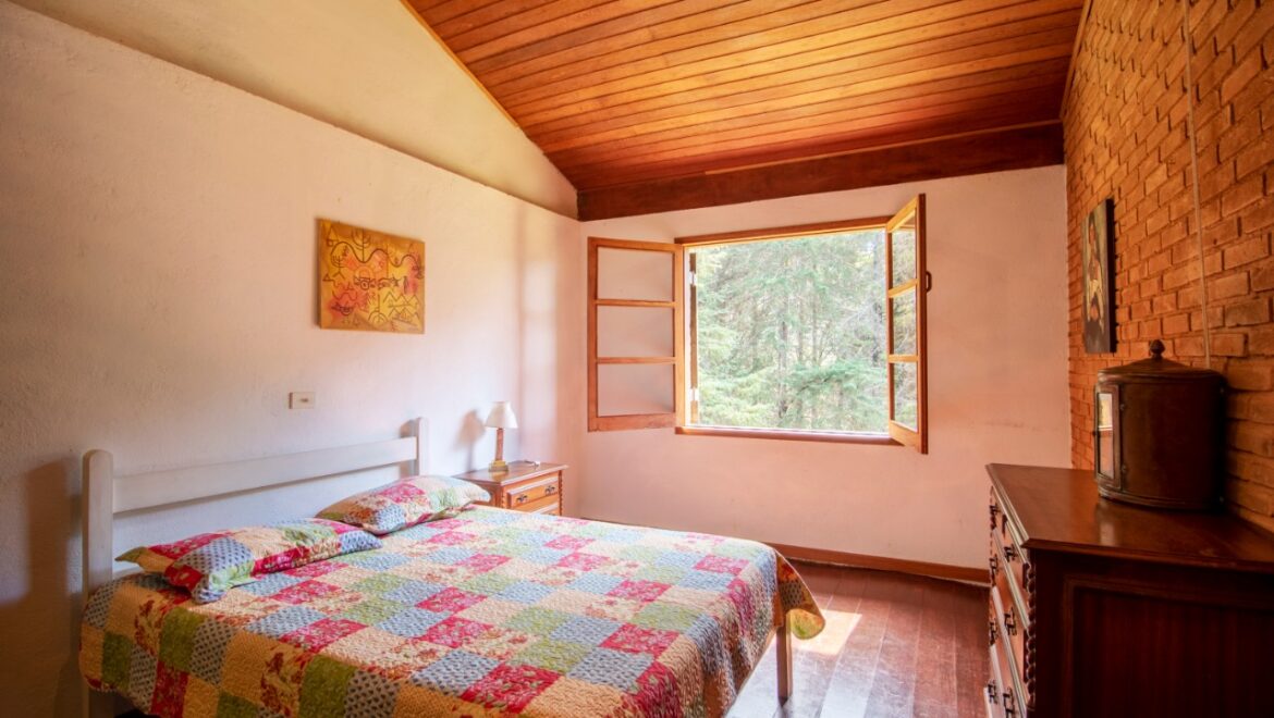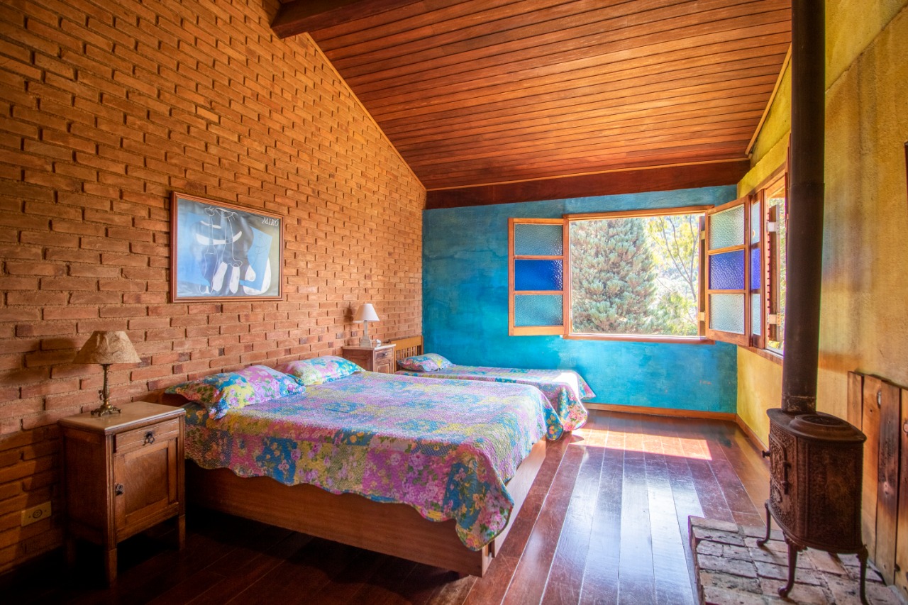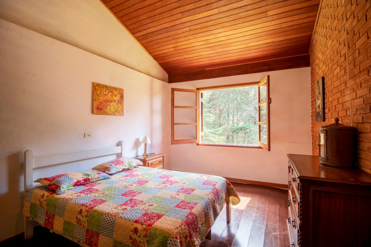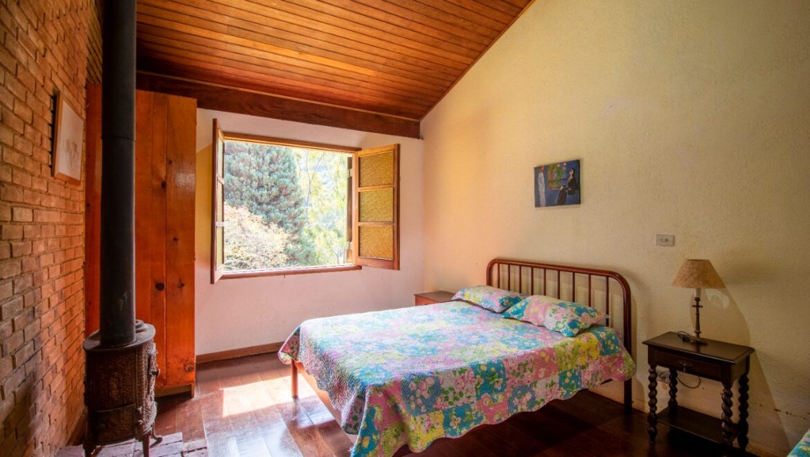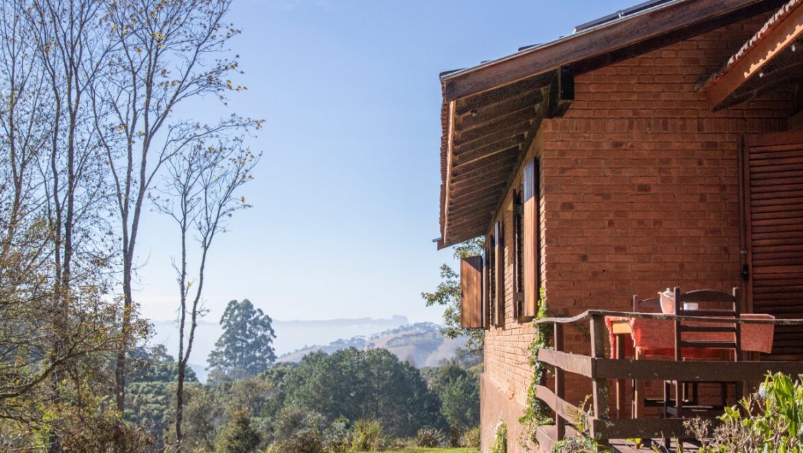 Arquitetura rústica de montanha, com paredes duplas em alvenaria, tijolos aparentes, janelas em madeira e vigas largas que valorizam o pé-direito alto. Uma construção sólida, charmosa e totalmente integrada às características naturais do local.