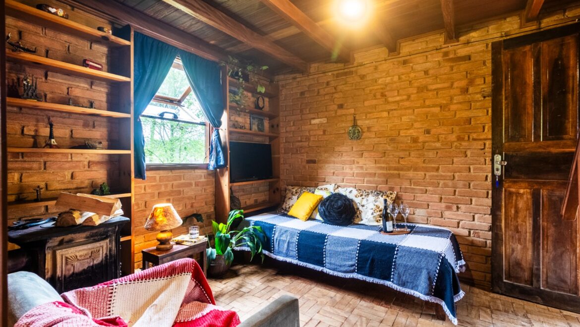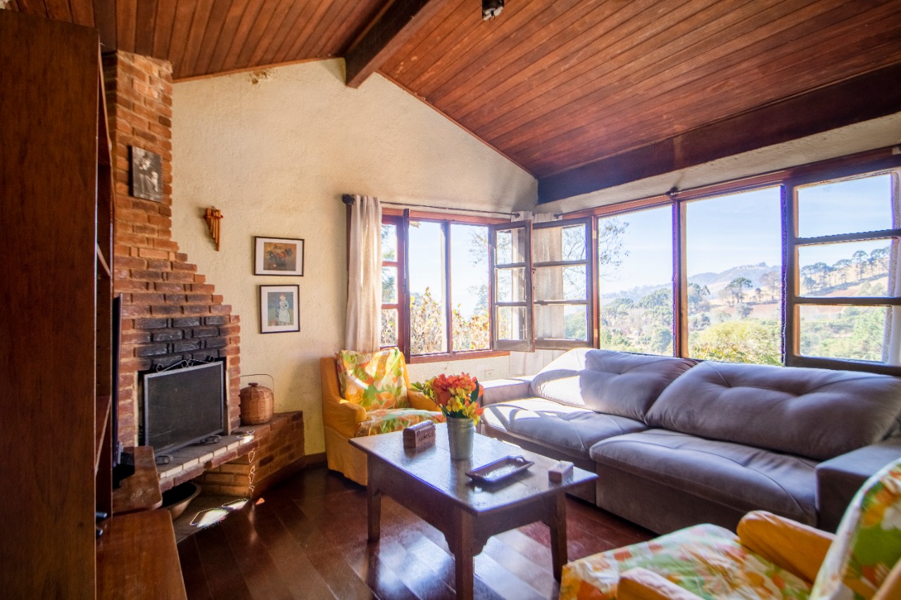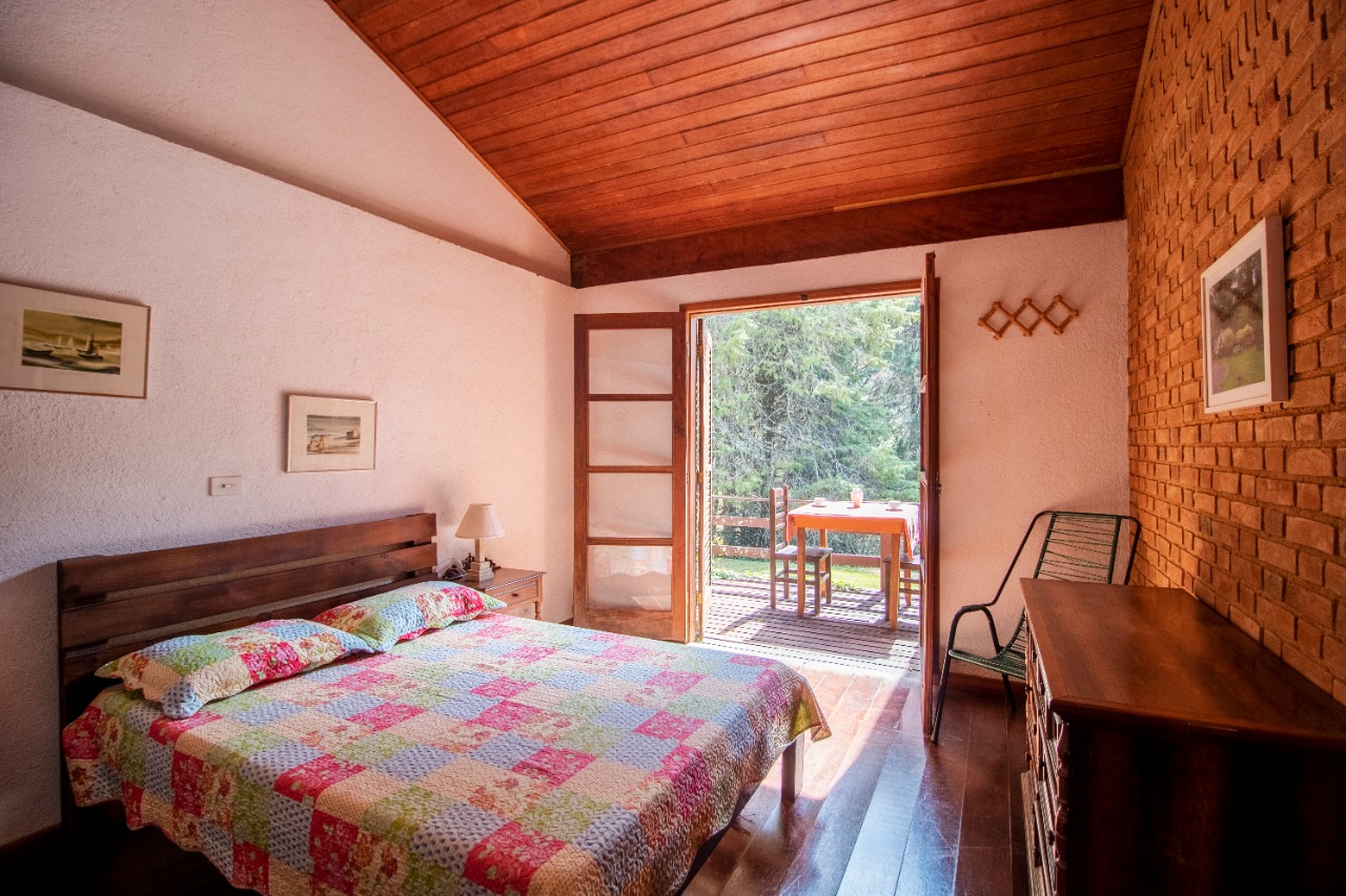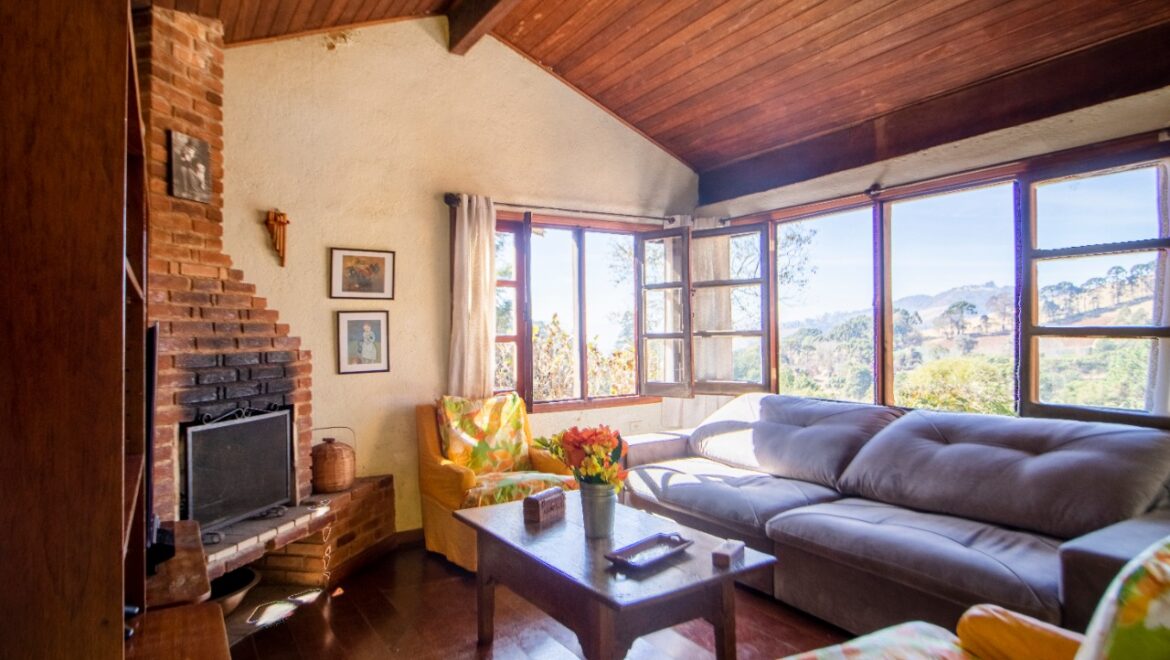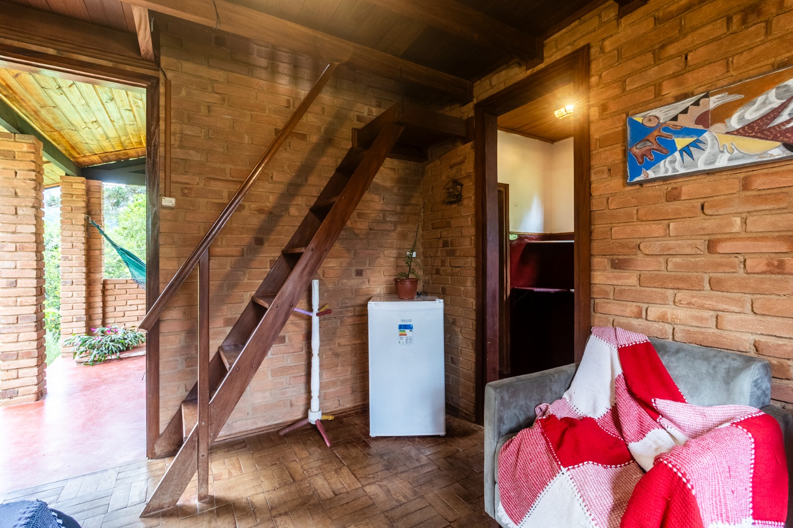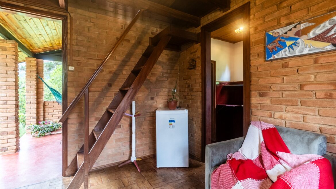 Arquitetura rústica de montanha, com paredes duplas em alvenaria, tijolos aparentes, janelas em madeira e vigas largas que valorizam o pé-direito alto. Uma construção sólida, charmosa e totalmente integrada às características naturais do local.