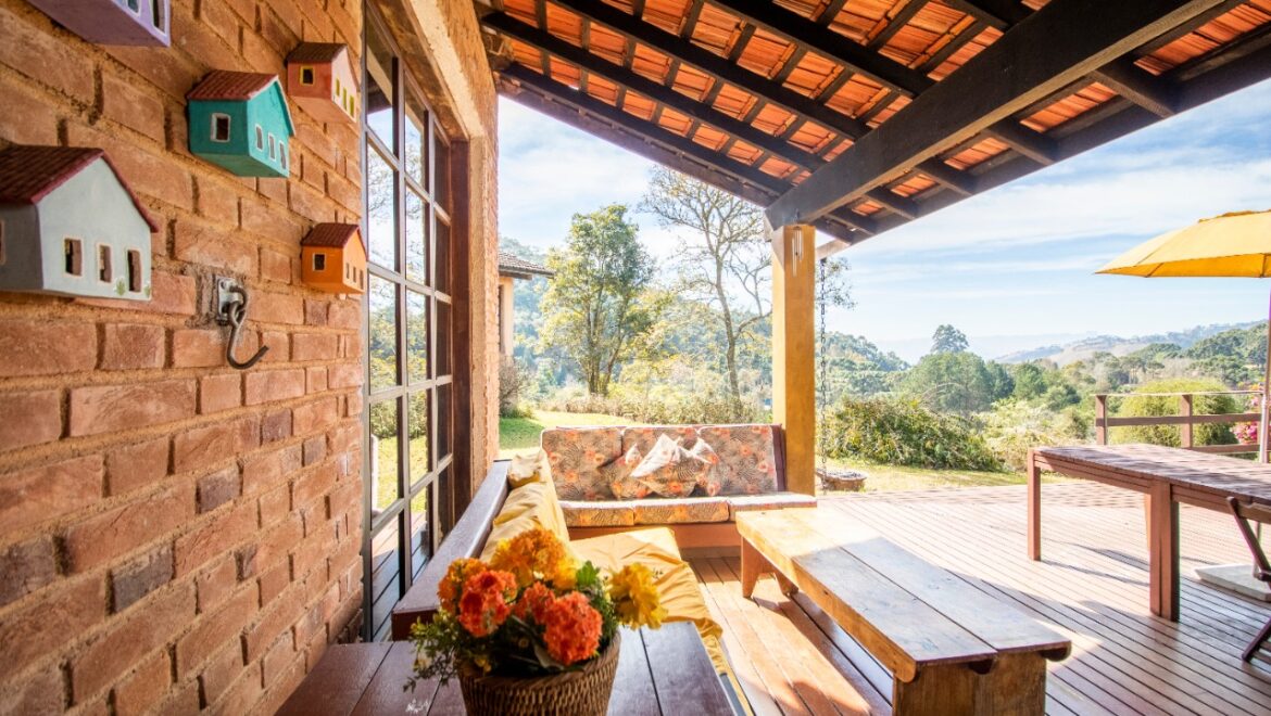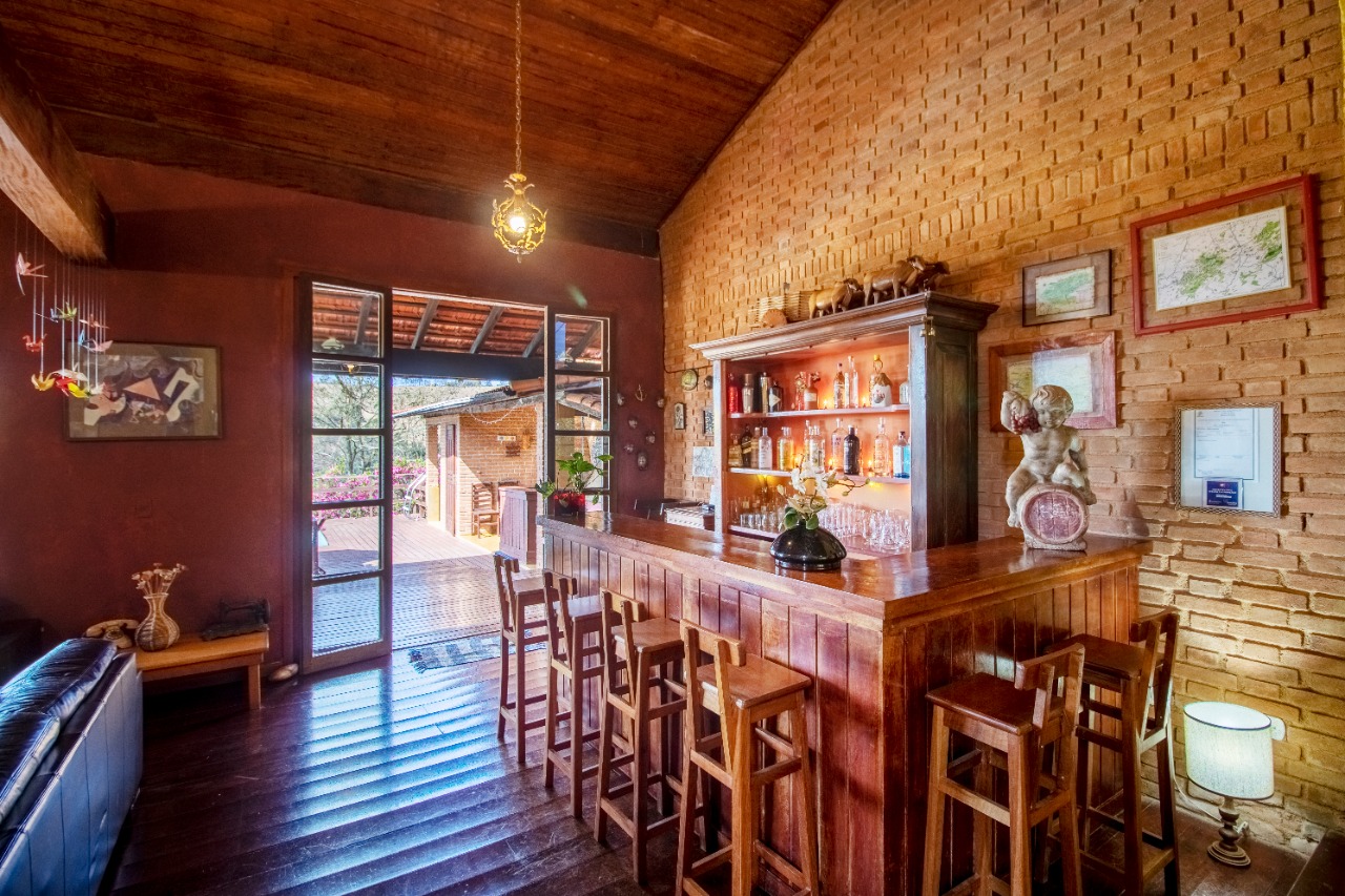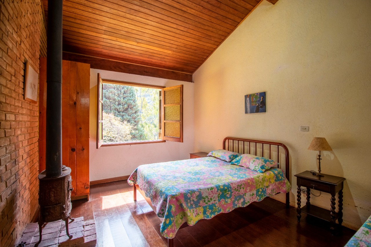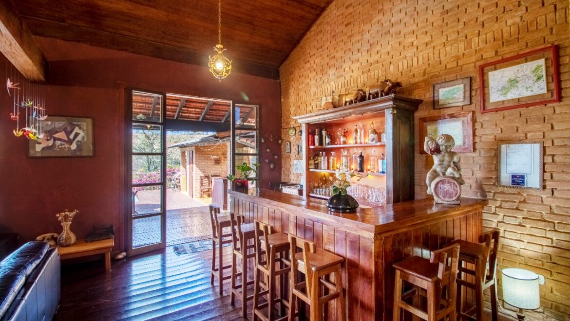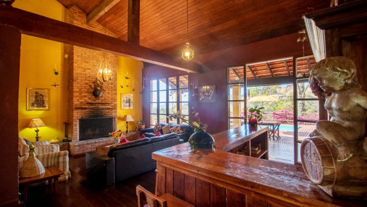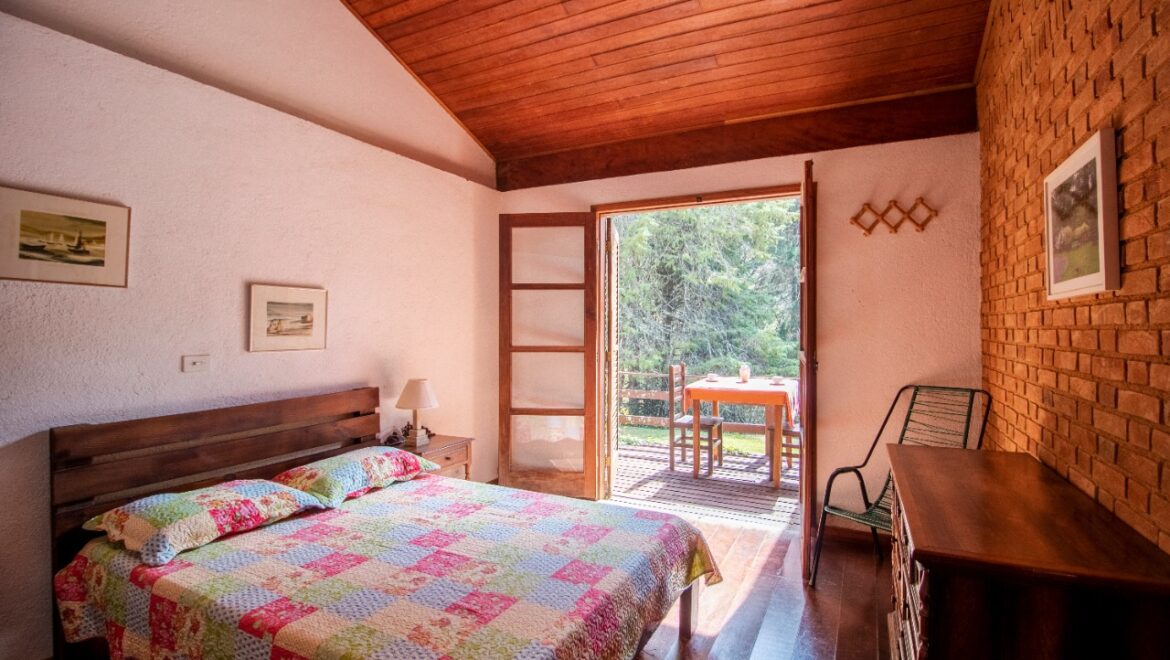 Arquitetura rústica de montanha, com paredes duplas em alvenaria, tijolos aparentes, janelas em madeira e vigas largas que valorizam o pé-direito alto. Uma construção sólida, charmosa e totalmente integrada às características naturais do local.