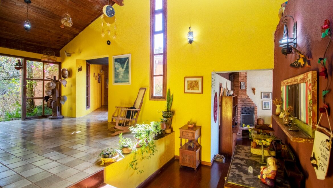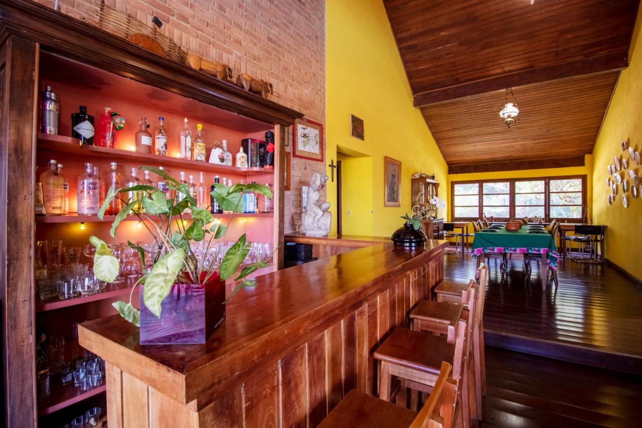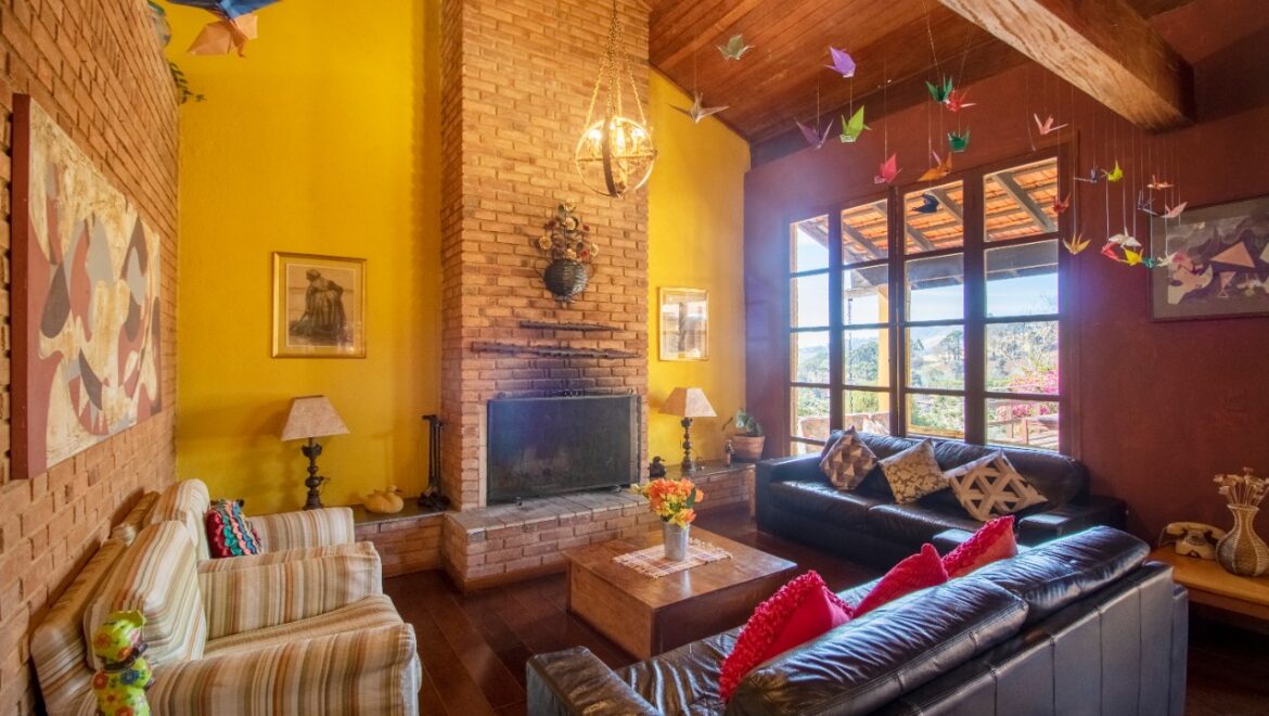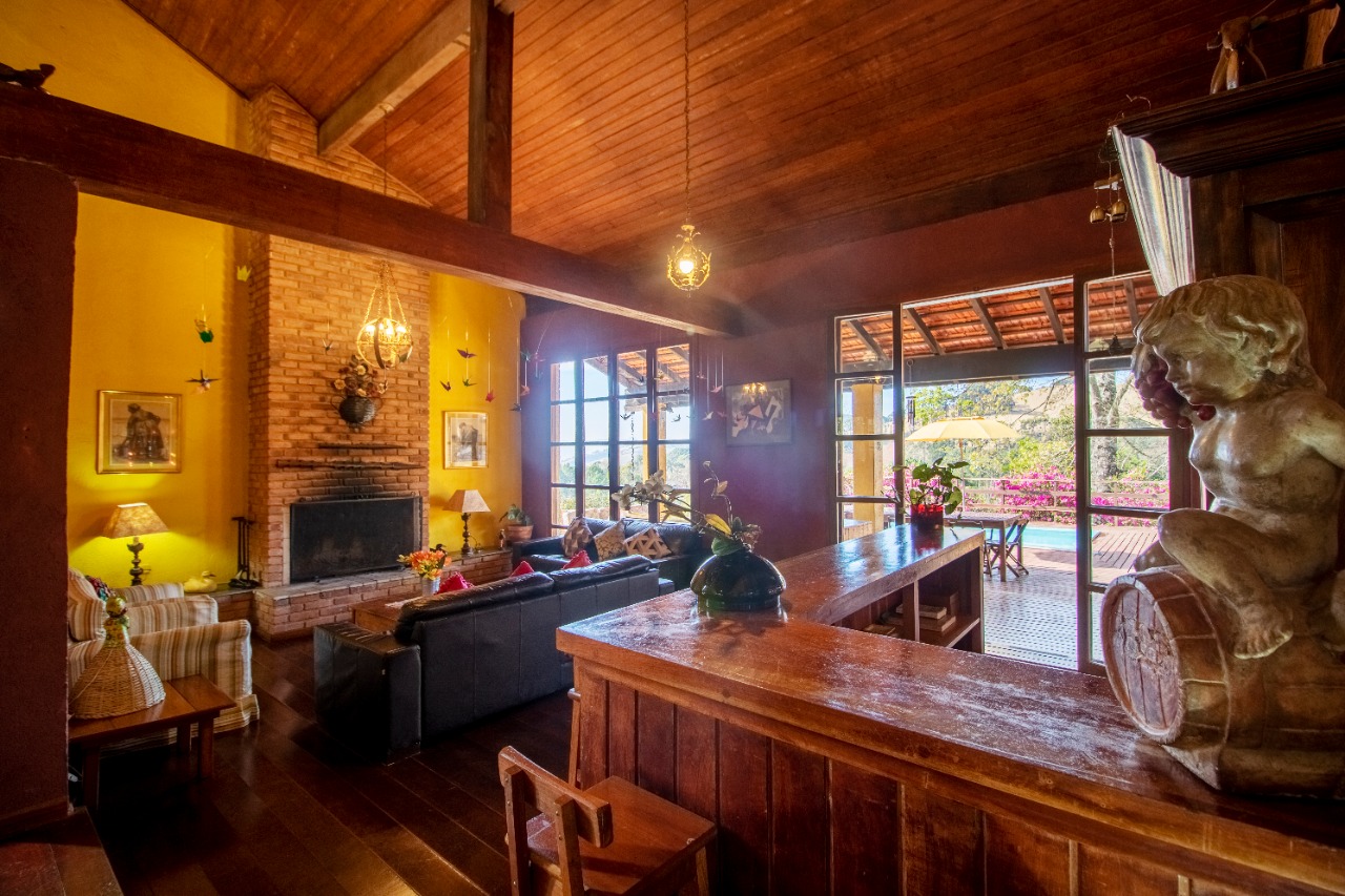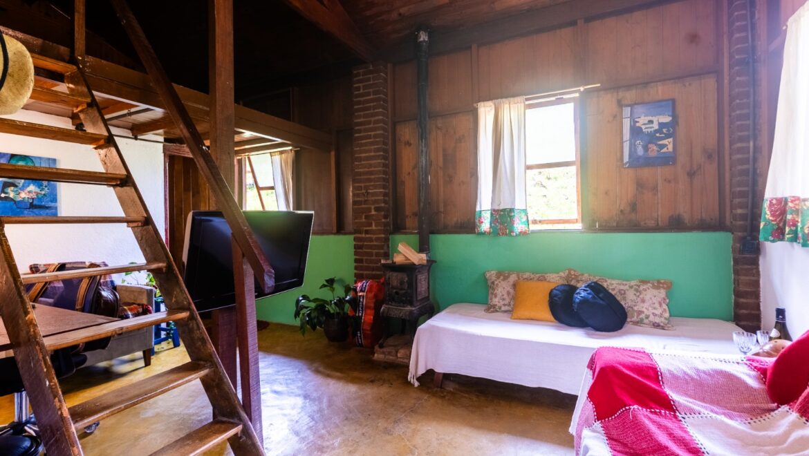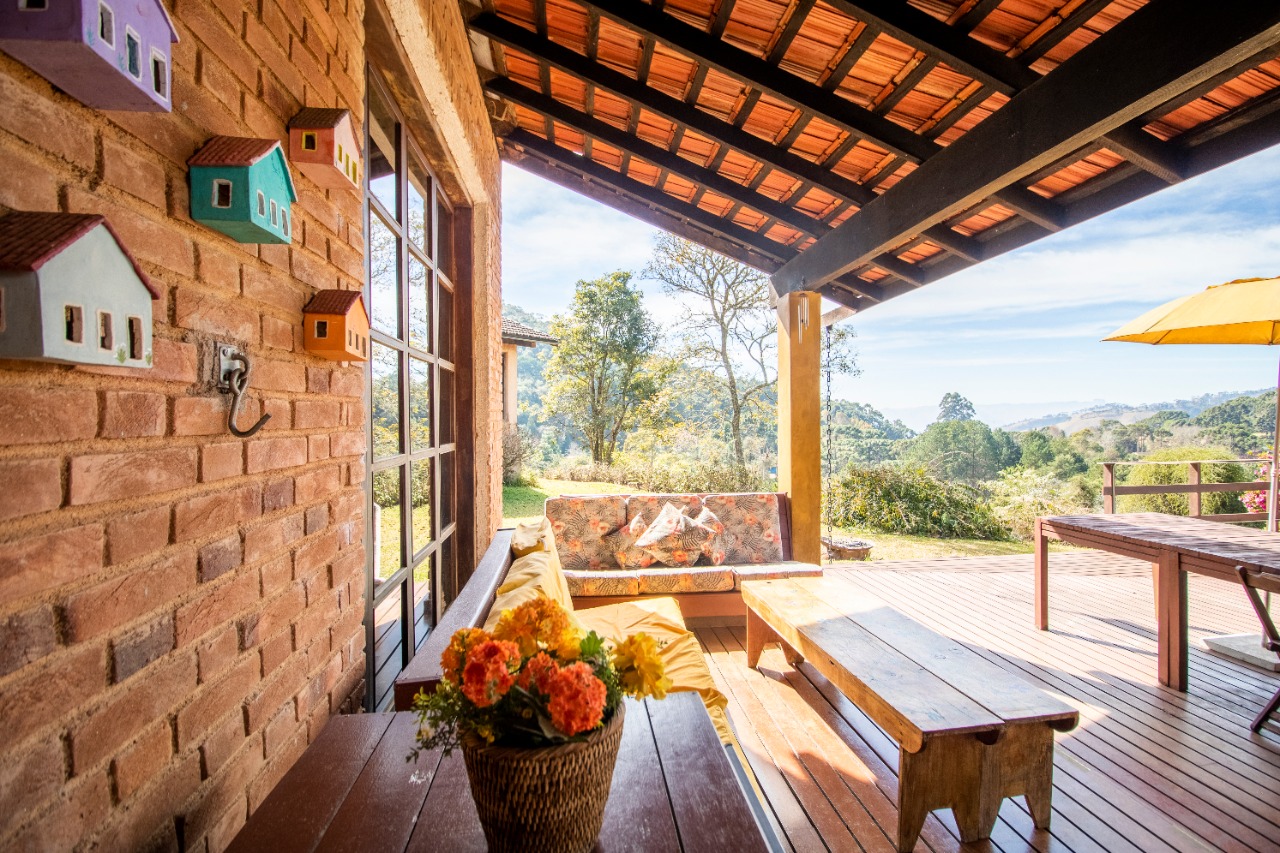 Arquitetura rústica de montanha, com paredes duplas em alvenaria, tijolos aparentes, janelas em madeira e vigas largas que valorizam o pé-direito alto. Uma construção sólida, charmosa e totalmente integrada às características naturais do local.