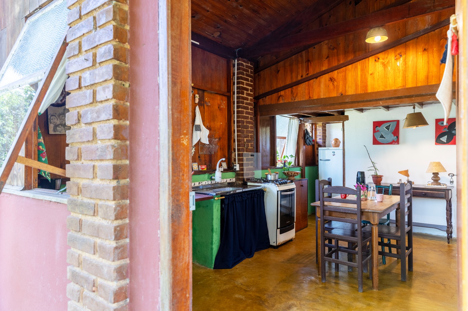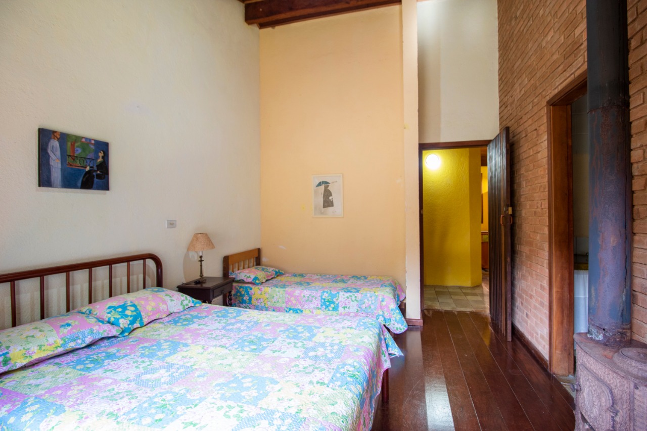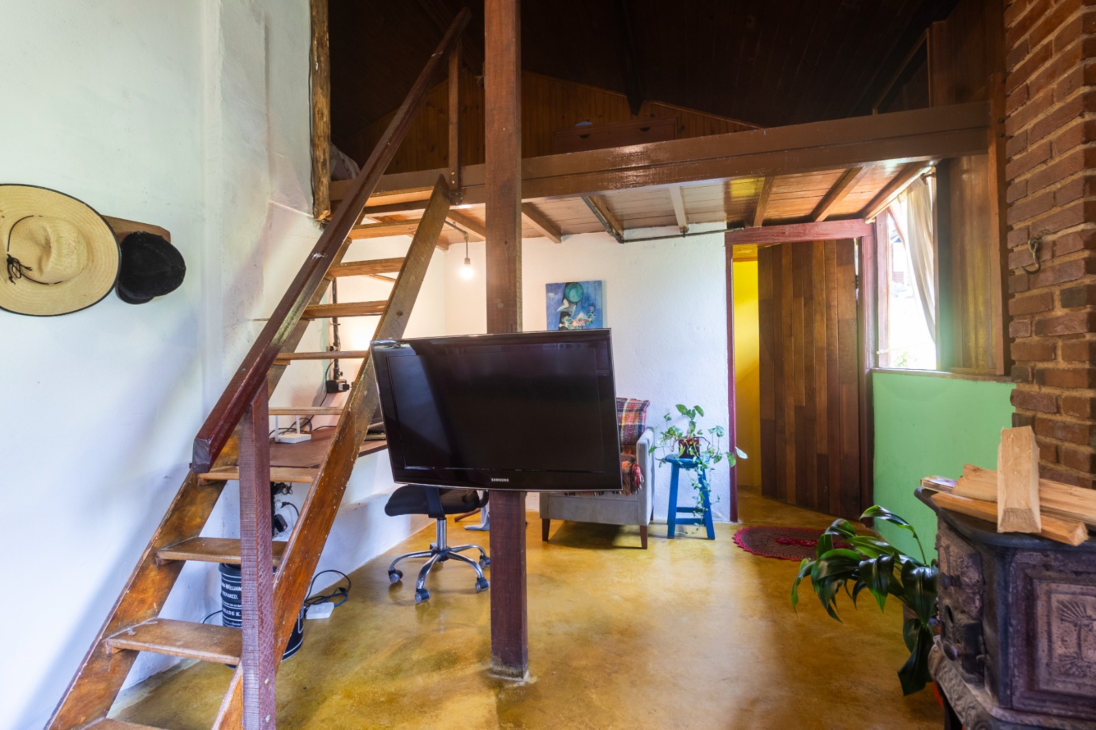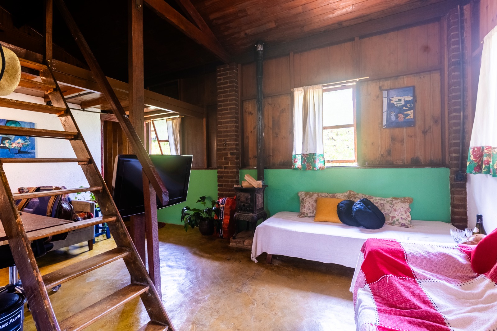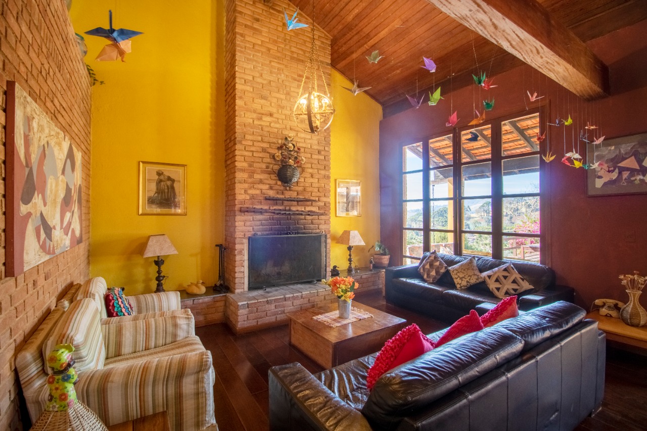 Arquitetura rústica de montanha, com paredes duplas em alvenaria, tijolos aparentes, janelas em madeira e vigas largas que valorizam o pé-direito alto. Uma construção sólida, charmosa e totalmente integrada às características naturais do local.