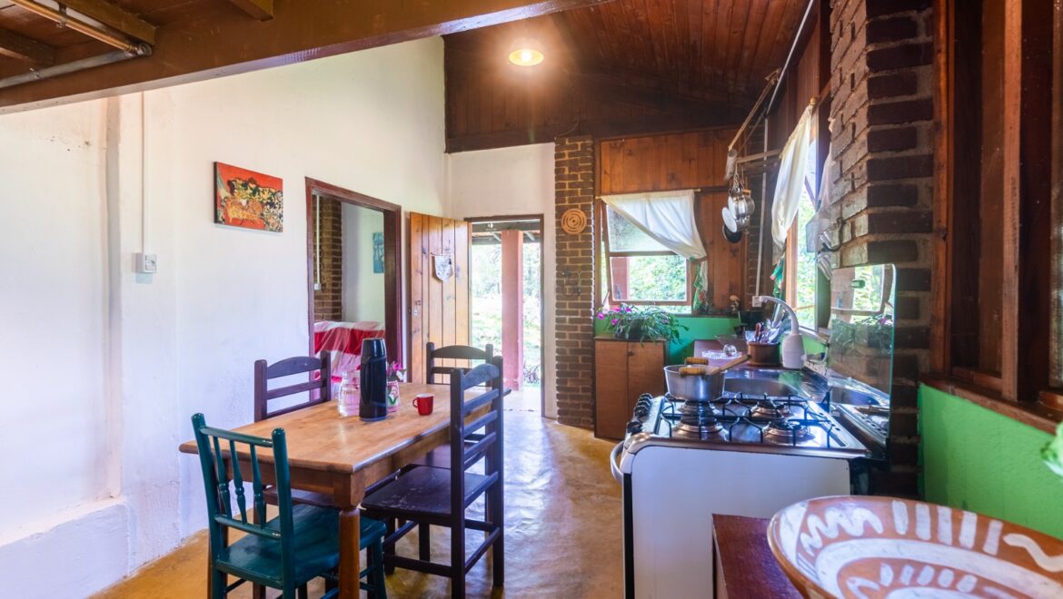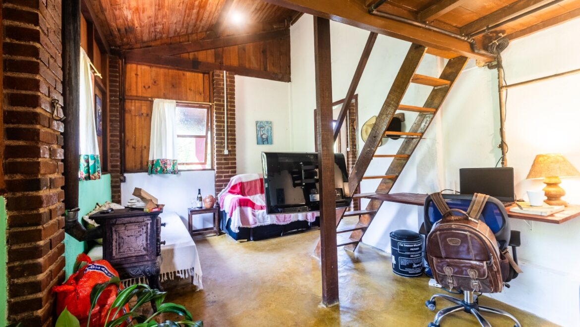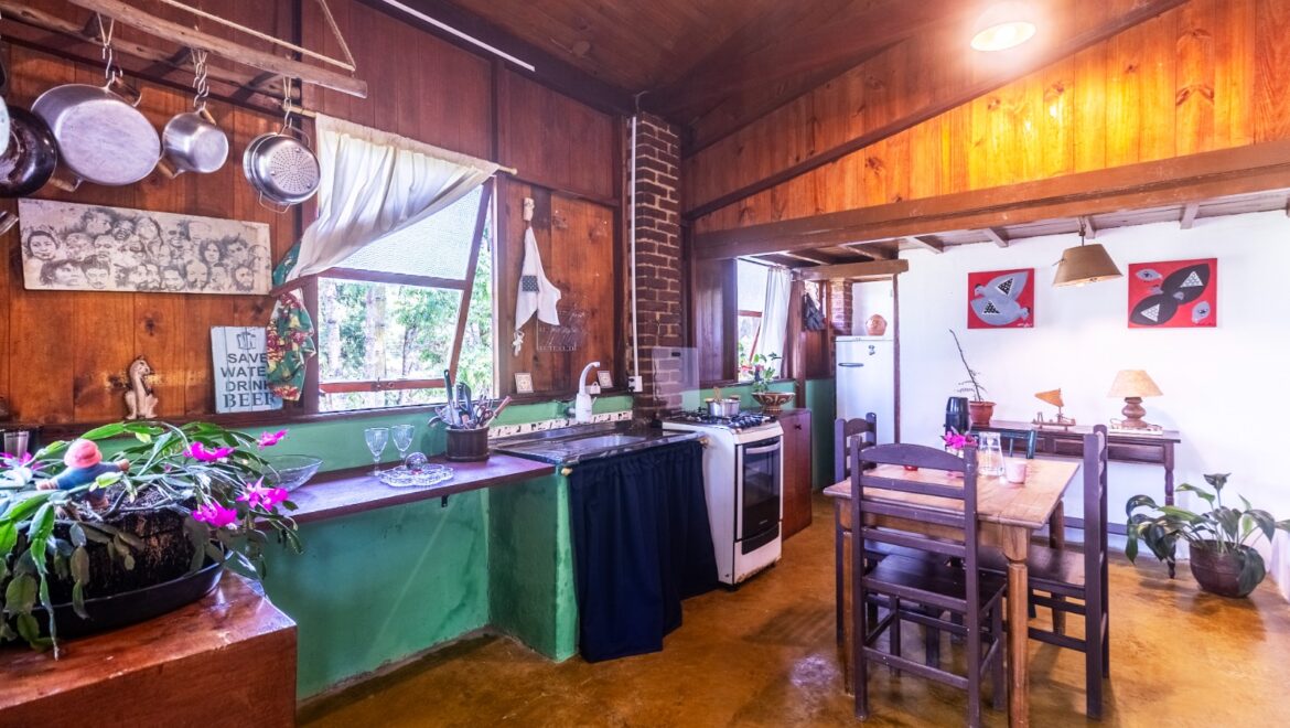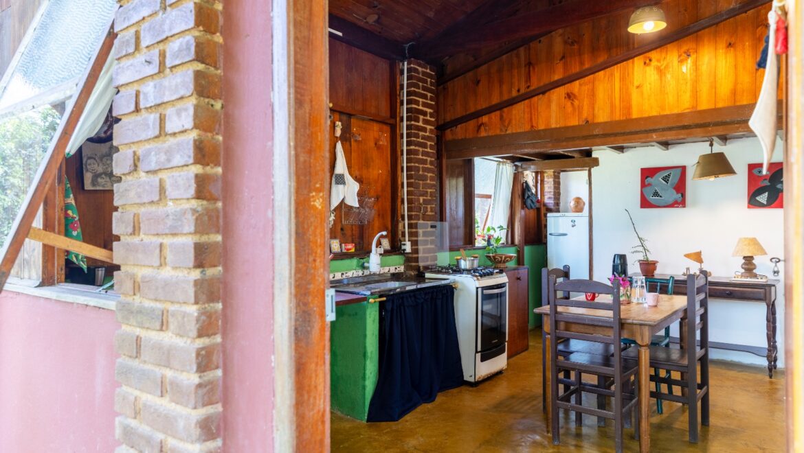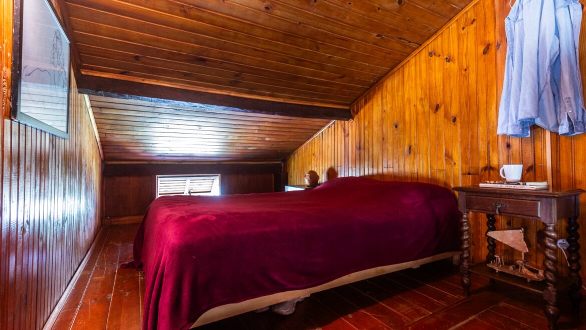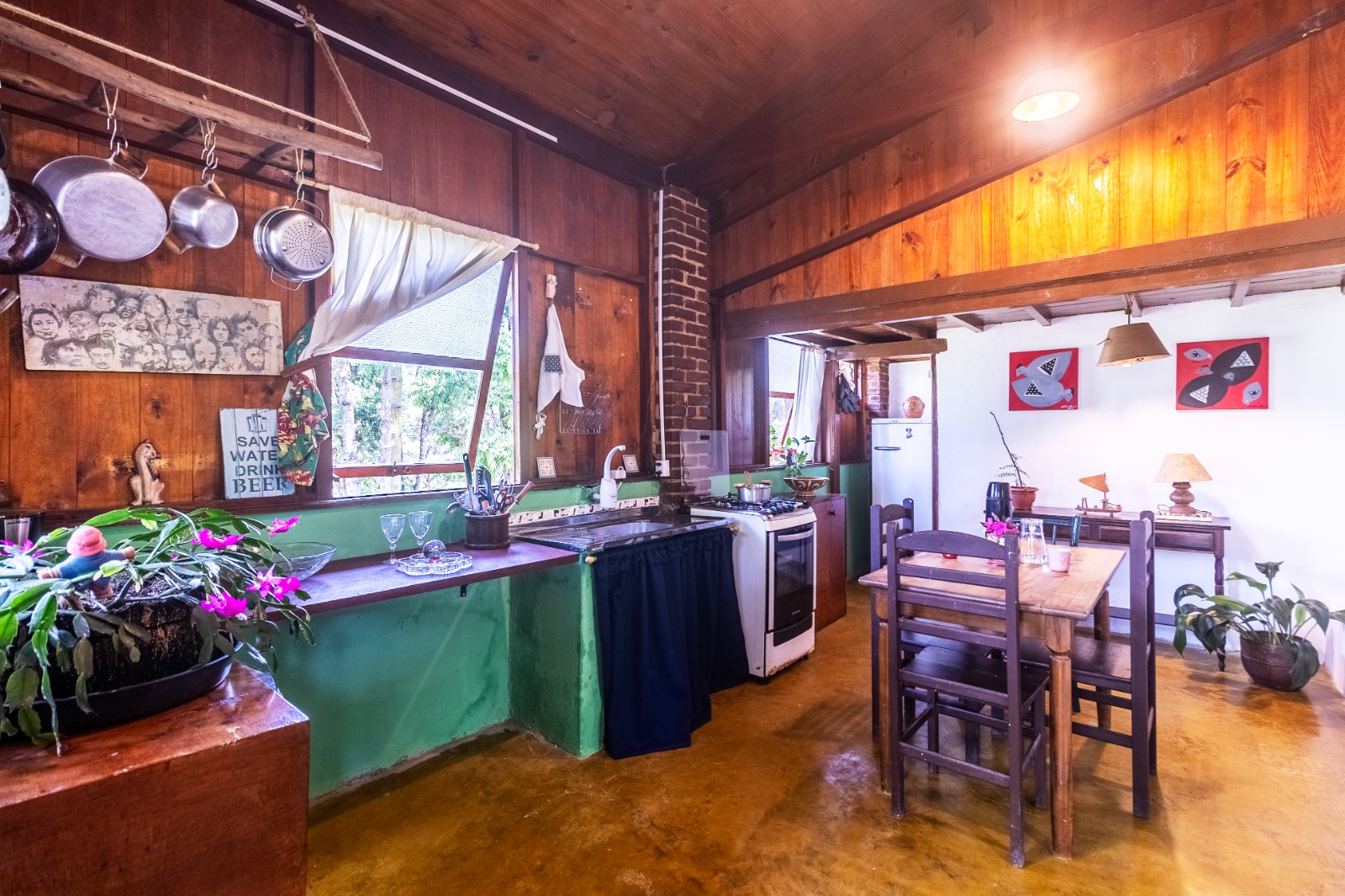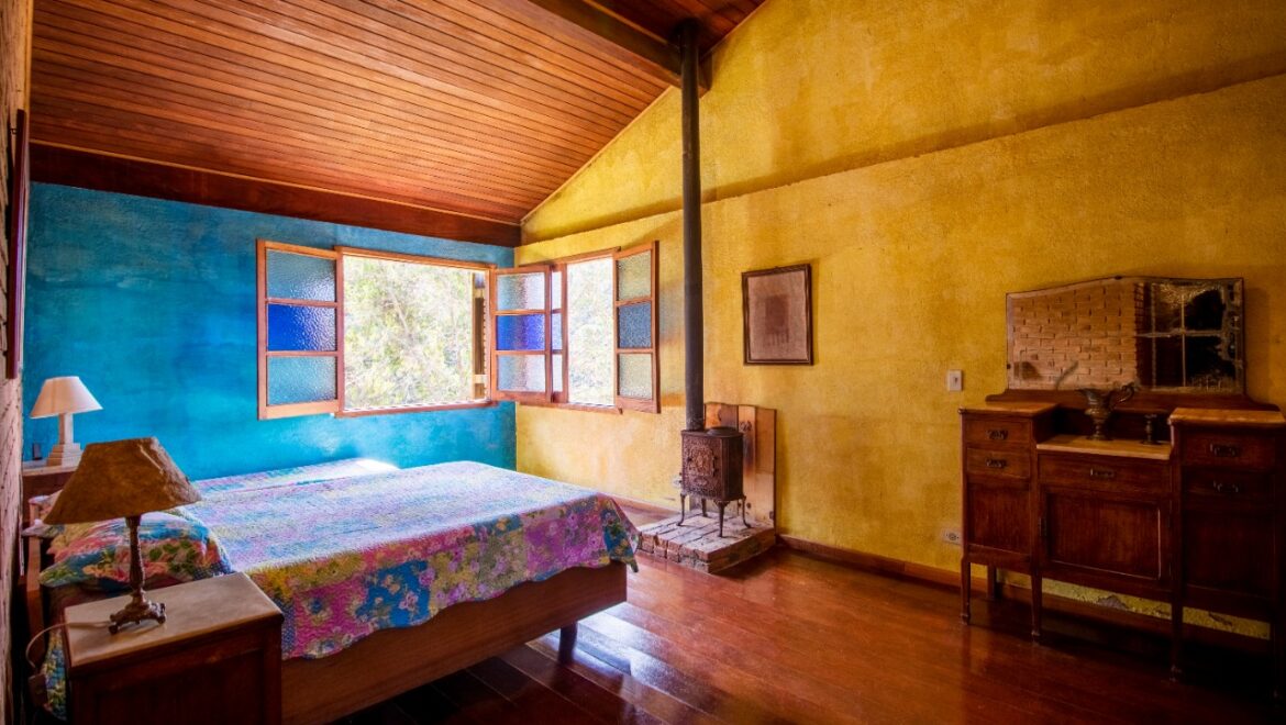 Arquitetura rústica de montanha, com paredes duplas em alvenaria, tijolos aparentes, janelas em madeira e vigas largas que valorizam o pé-direito alto. Uma construção sólida, charmosa e totalmente integrada às características naturais do local.