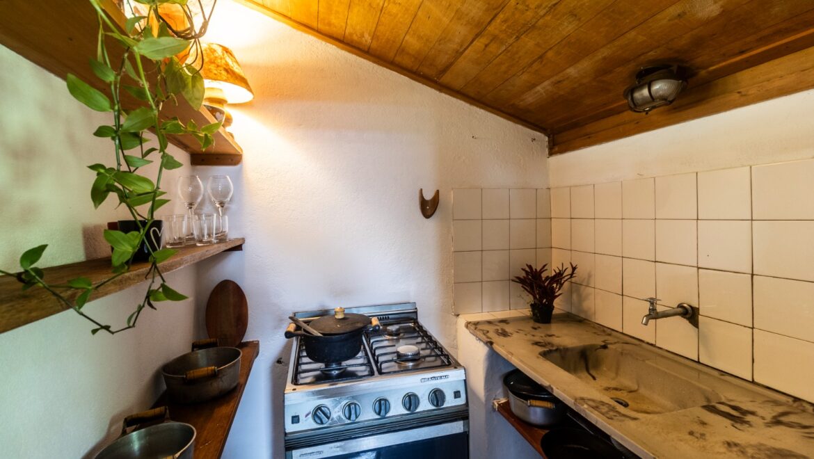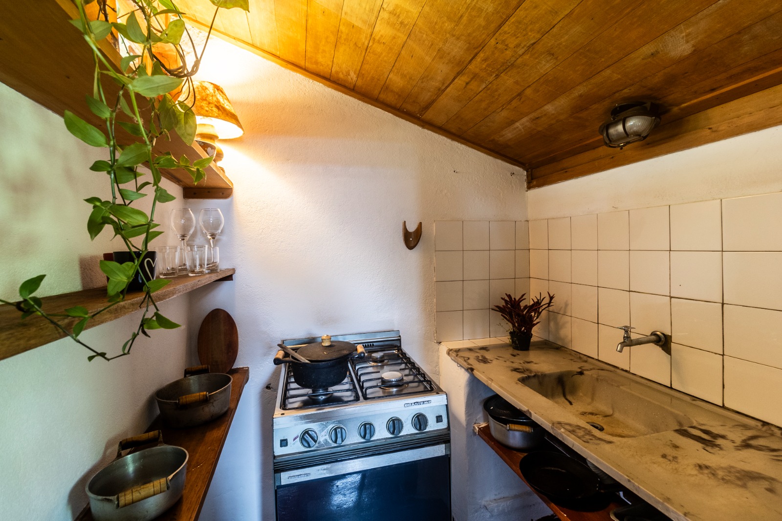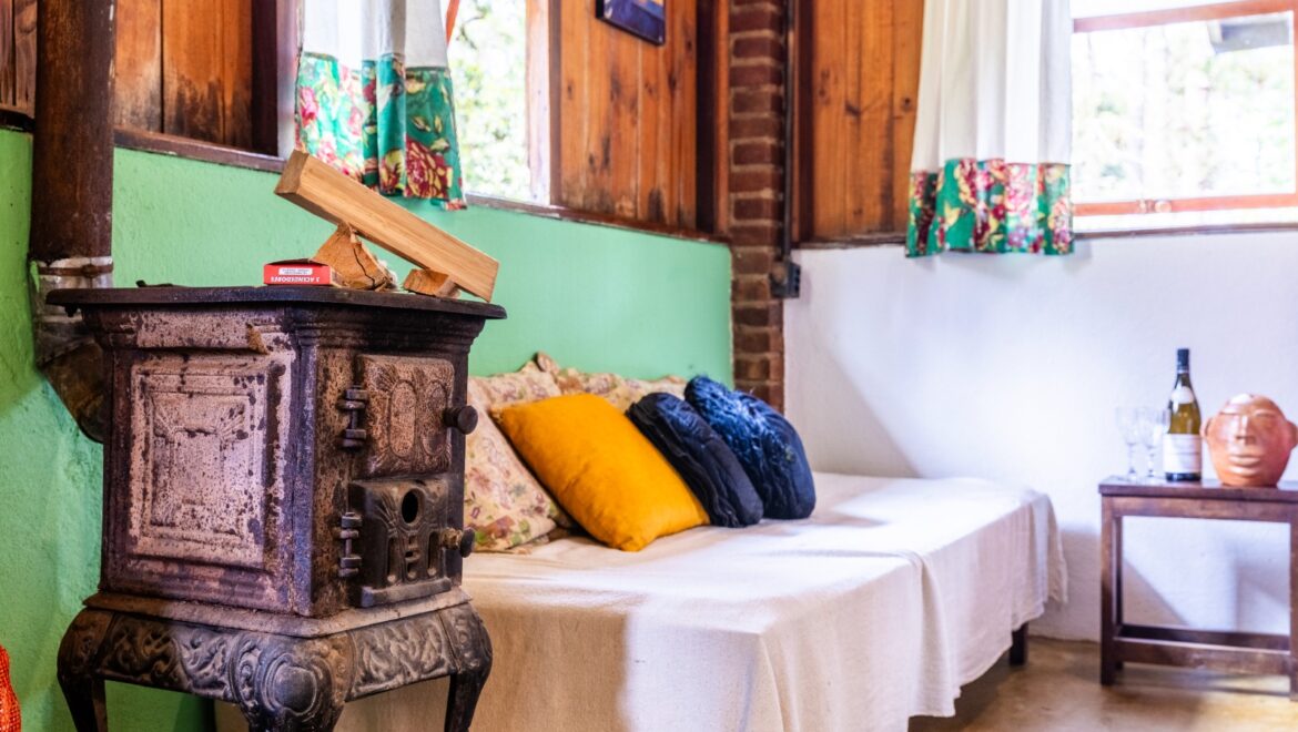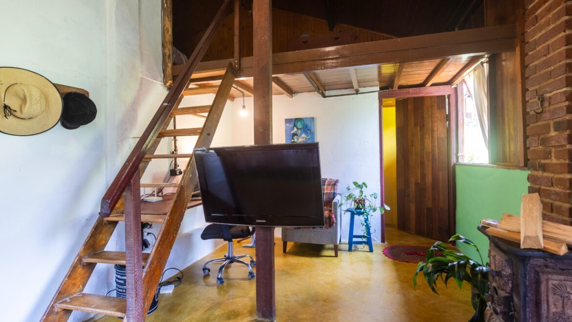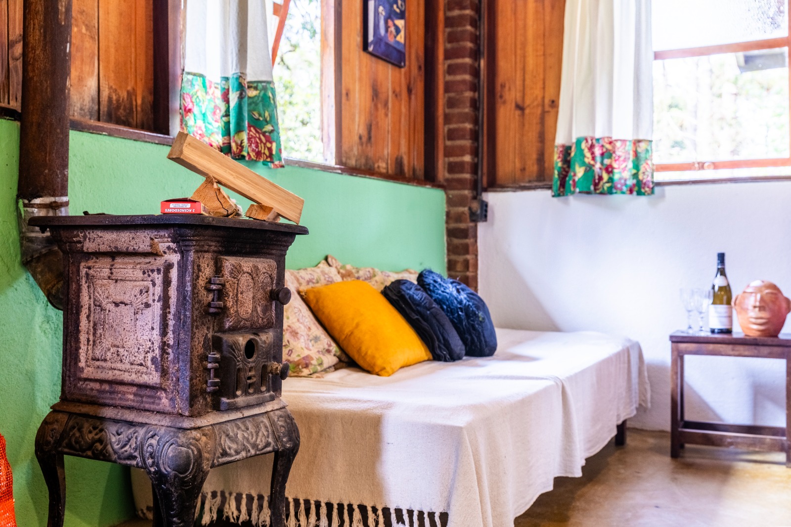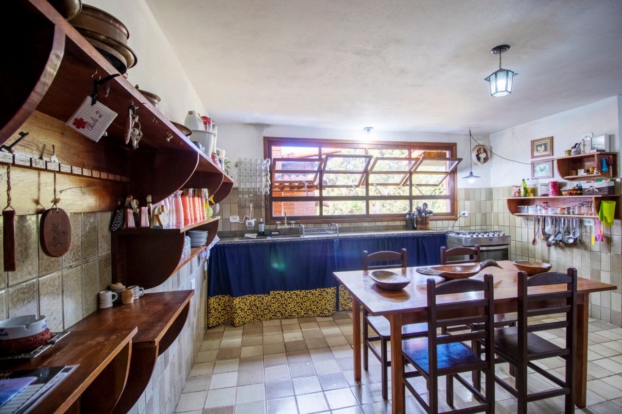 Arquitetura rústica de montanha, com paredes duplas em alvenaria, tijolos aparentes, janelas em madeira e vigas largas que valorizam o pé-direito alto. Uma construção sólida, charmosa e totalmente integrada às características naturais do local.