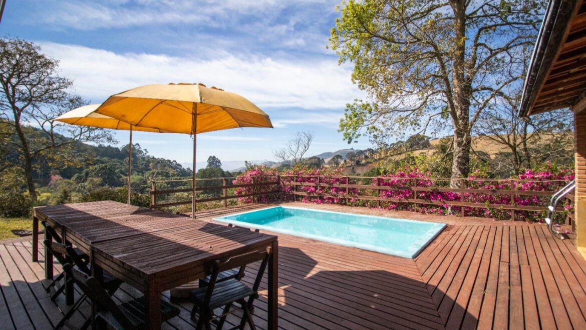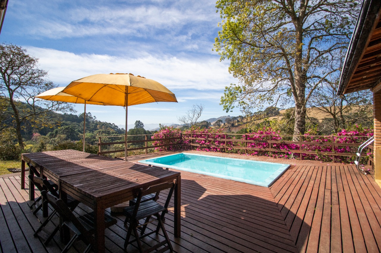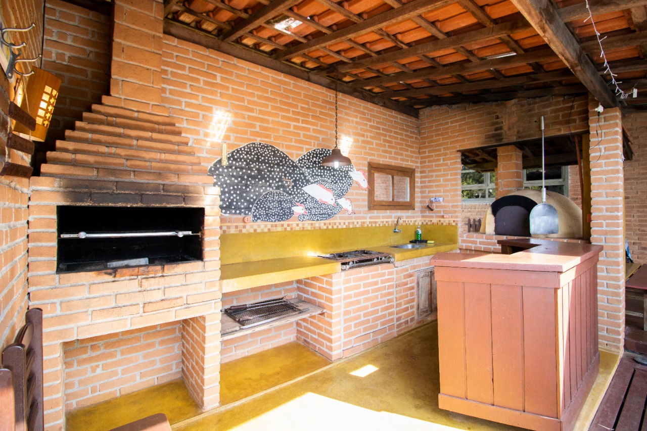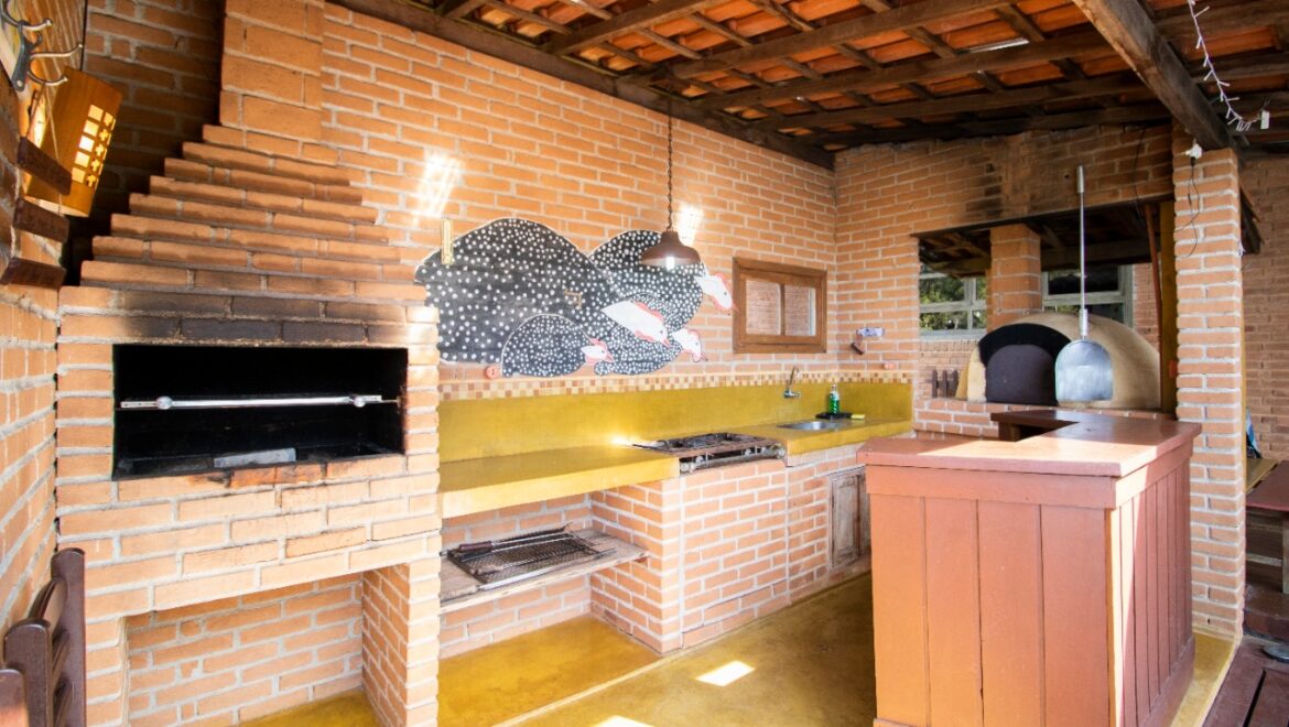 Na área externa da casa sede: Piscina e área de gourmet com churrasqueira e forno a lenha.