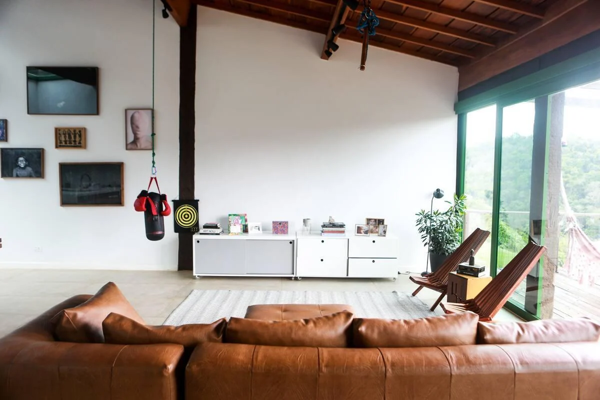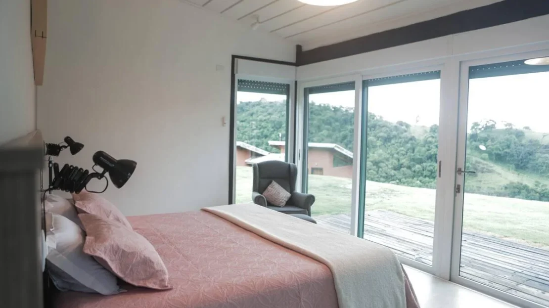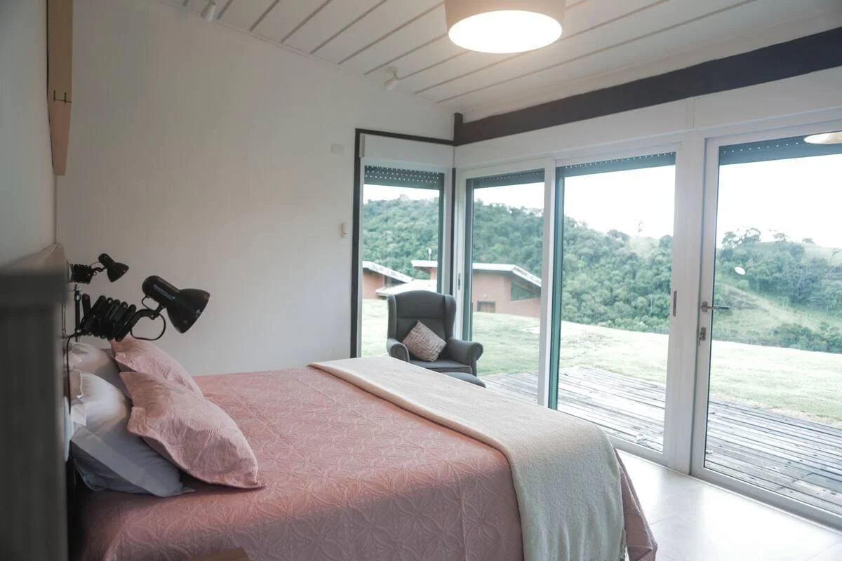 O CHALÉ escritório de 62 m², foi projetado para ser um espaço de estudos e trabalho em contato com a natureza e com distanciamento adequado da casa; O chalé tem um deck de madeira com vista para a floresta, bem perto dos pássaros e árvores, a inspiração está aqui. Construído com a mesma técnica sustentável da casa principal, ele conta com uma suíte com cama king size e um escritório biblioteca; para quem deseja receber amigos, esse é o chalé!